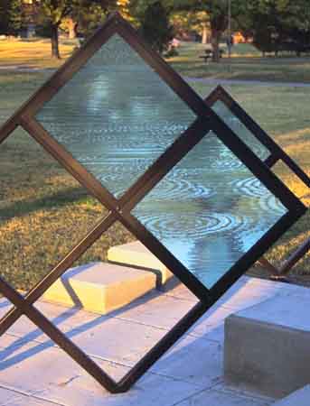 This sculpture was commissioned for the Art in Public Places Program of New Mexico Arts, a division of the Office of Cultural Affairs. KEN LEAP, Metamorphosis: Mind and Matter, 1999. Glass, steel, and concrete, 21' x 28' x 8.5'. Eastern New Mexico University, Portales, New Mexico. Closeup view from the South.