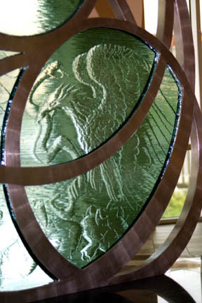 This sculpture was funded by the Bernalillo County 1% for Public Art Program. KEN LEAP, In Light of Justice II, 2001. In the 4th floor atrium of the Bernalillo County Courthouse in Albuquerque, New Mexico. Float glass, stainless steel, and granite, 9' x 6' x 9'.