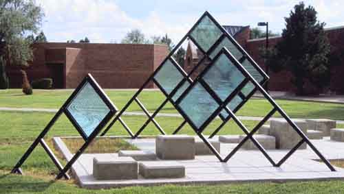This sculpture was commissioned for the Art in Public Places Program of New Mexico Arts, a division of the Office of Cultural Affairs. KEN LEAP, Metamorphosis: Mind and Matter, 1999. Glass, steel, and concrete, 21' x 28' x 8.5'. Eastern New Mexico University, Portales, New Mexico. View from the north.